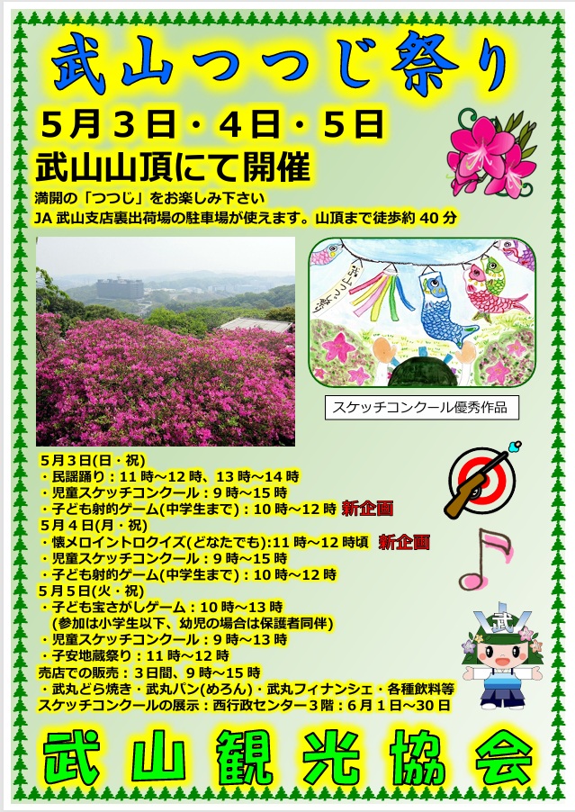 毎年5月3日~5日には、武山観光協会主催の「武山つつじ祭り」を開催し、児童スケッチコンクール、民謡踊りなどのイベントを実施します。
